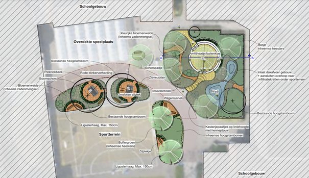 Our dream is to make SJABI’s schoolyard more resilient to climate change and make it a pleasant, stimulating and healthy learning environment. Therefore, we create a green oasis by removing pavements and adding greenery.